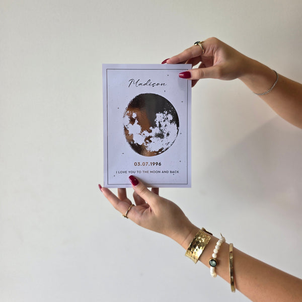 Each print is carefully created using astronomical data to ensure perfect accuracy of the moon phase for your chosen date, creating a deeply personal piece of artwork that connects your most precious memories to the moon.