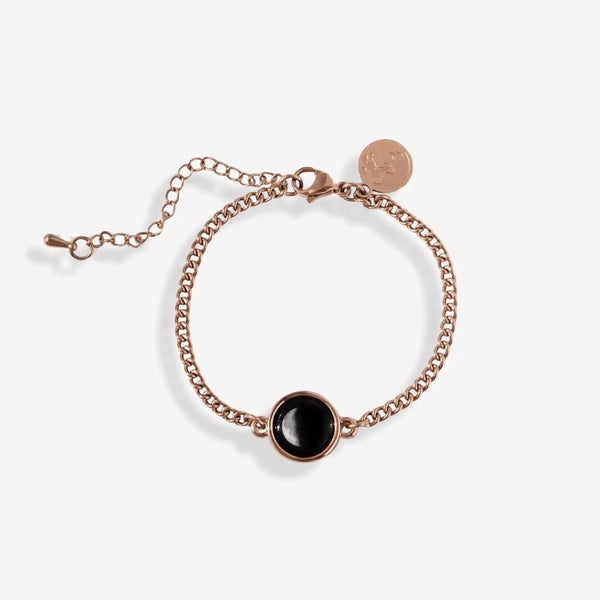 Feel the full power of your femininity with our newest design inspired by Pallene (pa-lee-nee), the small natural satellite that orbits Saturn. This playful yet deeply personal bracelet in dramatic rose gold circles the wrist for a look thats classic, timeless and modernly feminine. The adjustable chain link bracelet holds an eye-catching mini lunar charm that glows in darkness reminding you of a cherished moment that connects you to the moon. And like a magnet for all good things, it inspires wonder and conversation every time you wear it. Choose it now for yourself or someone dear to you. Your bracelet will arrive complete with a card describing the moon phases you've selected.