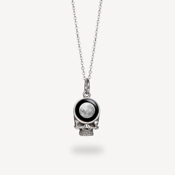 The Moon Skull is a simple classic pewter skull pendant.  Every moon glows in dark environments just like the moon in the sky that night, which serves as a constant reminder of the events and people that are important to you.