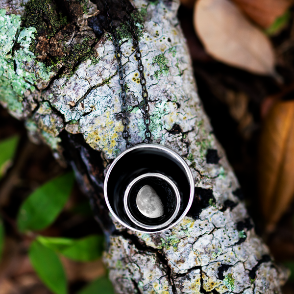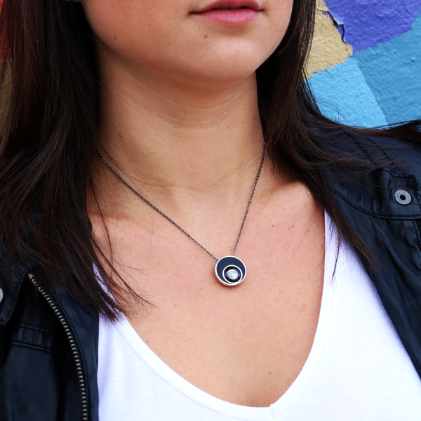The Orbit is a simple classic pewter pendant.  Every moon glows in dark environments just like the moon in the sky that night, which serves as a constant reminder of the events and people that are important to you.