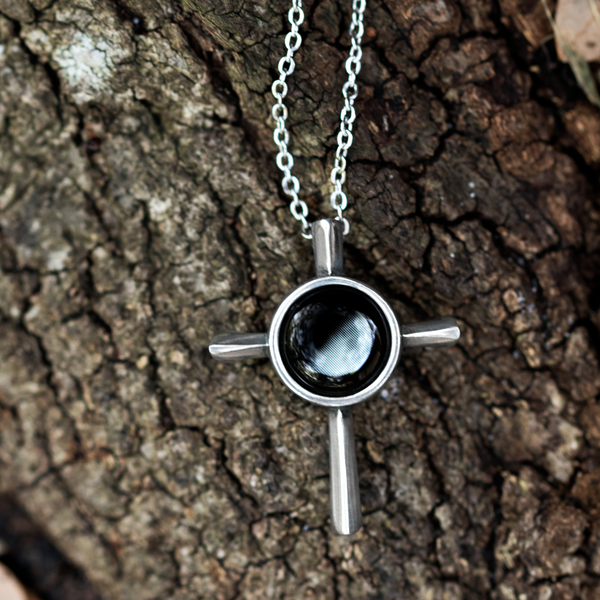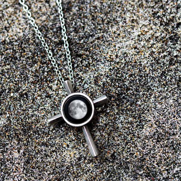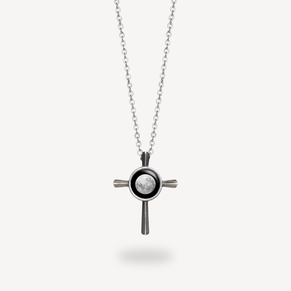 The Skinny Cross is a simple classic pewter cross pendant.  Every moon glows in dark environments just like the moon in the sky that night, which serves as a constant reminder of the events and people that are important to you.