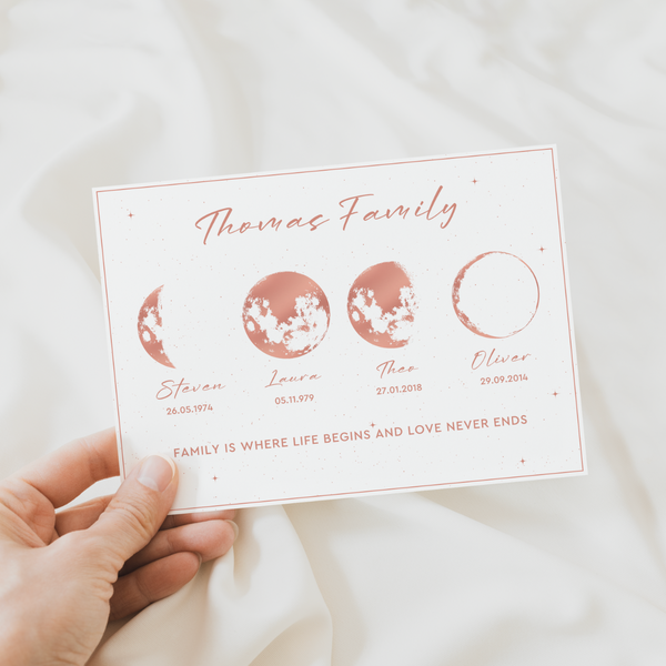 Each print is carefully created using astronomical data to ensure perfect accuracy of the moon phase for your chosen date, creating a deeply personal piece of artwork that connects your most precious memories to the moon.
