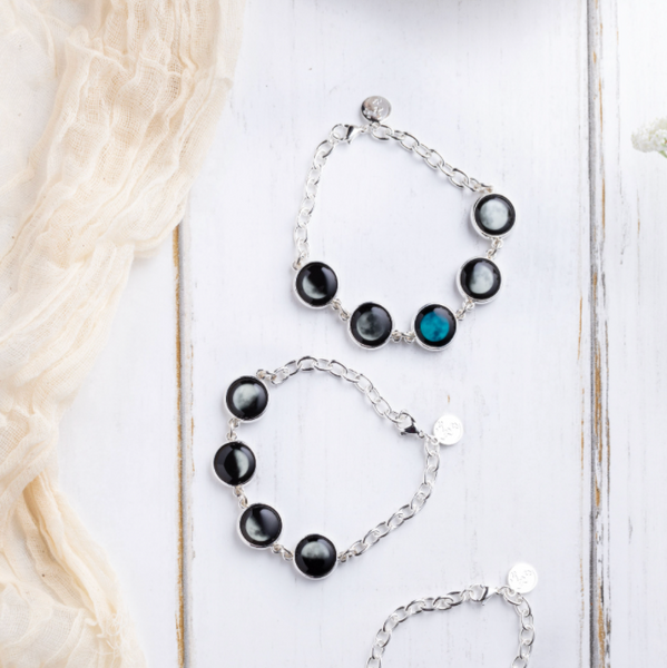 Once you have selected your date, choose from our collection of bracelets, necklaces and more to carry your detailed high resolution image. As an added bonus, your moon will gently glow in the dark, reminding you of that special moment.