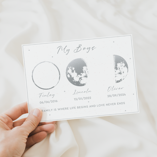 Each print is carefully created using astronomical data to ensure perfect accuracy of the moon phase for your chosen date, creating a deeply personal piece of artwork that connects your most precious memories to the moon.