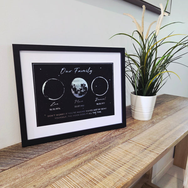 Transform any meaningful date into a timeless keepsake. Whether celebrating a birth, anniversary, wedding day, or honouring the memory of a loved one, our custom moon phase prints preserve that exact moment forever.