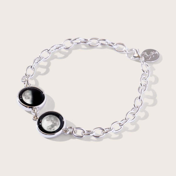 The Two Moon Bracelet features 2 personalised charms, custom-made using the moon phases from the dates of your choice. The double moons symbolically unite two significant life events or individuals, such as your birth moon phase and the moon phase of your partner or child.