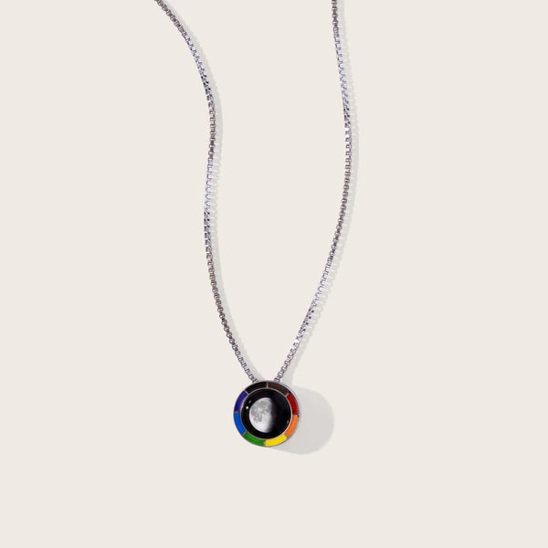 With a thin chain, the main focus is the Moon pendant, which not only showcases the Moon from any date you choose but also features the pride flag tastefully around it. Celebrate who you are, who you love and those moments you never want to forget.