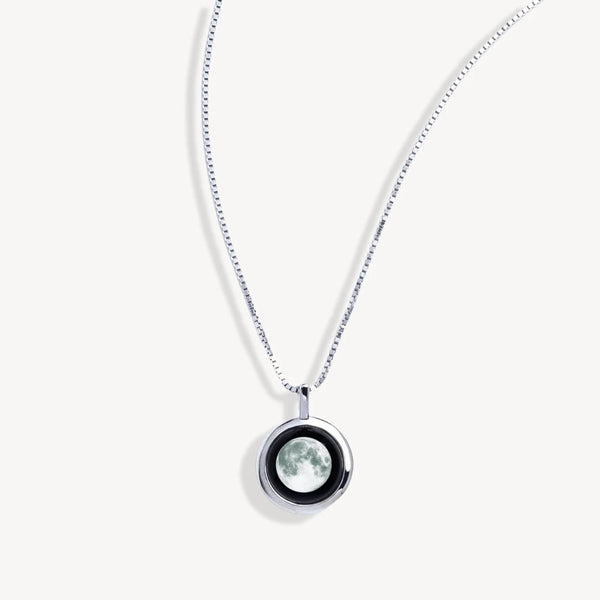 The Theia necklace in Sterling Silver is a must-have for moon lovers. As the Titan goddess of the shining sky, and mother of moon goddess Selene, Theia embodied precious metals and brilliant light. Made of genuine .925 sterling silver, the Theia Necklace features a picture of the moon from any significant date of your choice. Set in a 14mm sterling silver pendant on a sterling silver square box chain that is adjustable from 16.5" up to 18" so you can wear it at the perfect length.