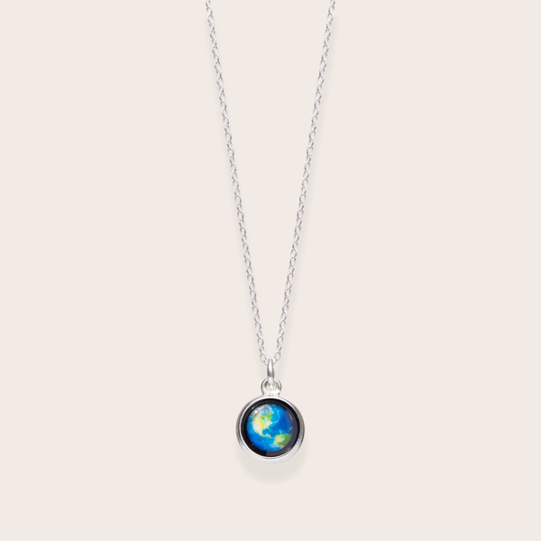 Moonglow's brilliant Earthglow Mini Silver Pendant , cradled in luminous silver plate, holds our collective hopes and dreams for our planet close. And like all of our signature designs, the Earthglow Mini Silver Pendant will capture the light by day to glow in darkness as a soulful reminder of what matters most.