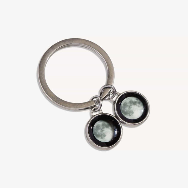 Two Moon Memory Keychain. Rock your celestial style with this uniquely personal moon phase pendant simply designed to wow! Artfully crafted in luminous stainless steel, our uniquely personal moon key ring features two full-sized lunar charms that allows you to commemorate two special moments in time.